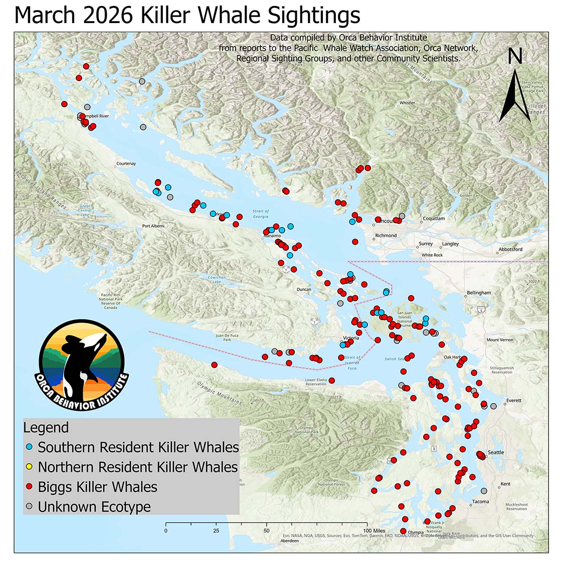 After a bit of a lull in January and Februry, the Bigg's killer whales marched back into the Salish Sea (pun intended) last month. We were able to help confirm their presence in the Salish Sea for all 31 days in the month of March with a record-setting 165 unique sightings. (We count a sighting as a unique group of animals seen on a unique day. The first known location of each unique sighting is shown on the map here.)